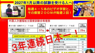 ご案内介護福祉士国家試験対策ZOOM復習授業動画ユーチューブ配信コース 月額490円 ユーチューブメンバー限定配信 介護福祉士国家試験対策ZOOM講義動画のご案内 ユーチューブで毎週2回動画配信、介護福祉士国家試験対策のビデオで勉強 2025年度が2月からまた始まっています。 月々490円のメンバーになっていただくと、原則... 2022.06.03ご案内介護福祉士国家試験対策外国人介護福祉士国家試験対策学習支援教材講座案内